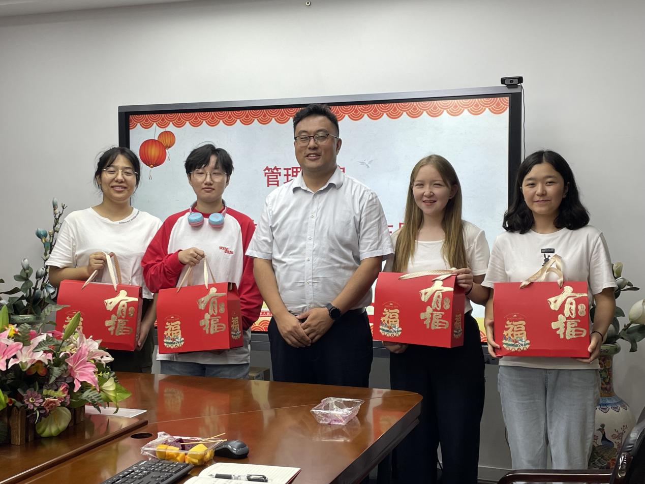 学院为同学们准备了水果和月饼,大家在喜悦融洽的气氛中依次分享了入校以来学习、生活的感想和对未来四年大学生活的憧憬与向往,老师们在认真聆听之后询问各位同学对学校环境、大学课堂、生活是否习惯等问题,并提出在学习生活中遇到问题要及时与老师交流沟通反馈。陈伟代表学院向与会的学生表达了节日的问候,并对大家的到来表示热烈欢迎,他饱含深情的寄语2023级的同学们,希望大家要做厚植家国情怀的大学生,永远葆有一颗爱国心,增强社会责任感和使命感;要做饱含进取心的大学生,立足实际,科学合理地规划自己的大学生涯,志存高远,让自己的人生道路走得更正、走得更远;要立志做全面发展的大学生,强化专业认知,提升专业能力,重视自身综合素质的全面提升,全力走好新时代青年的成才之路。最后陈书记向参会的新生代表赠送了中秋礼盒。