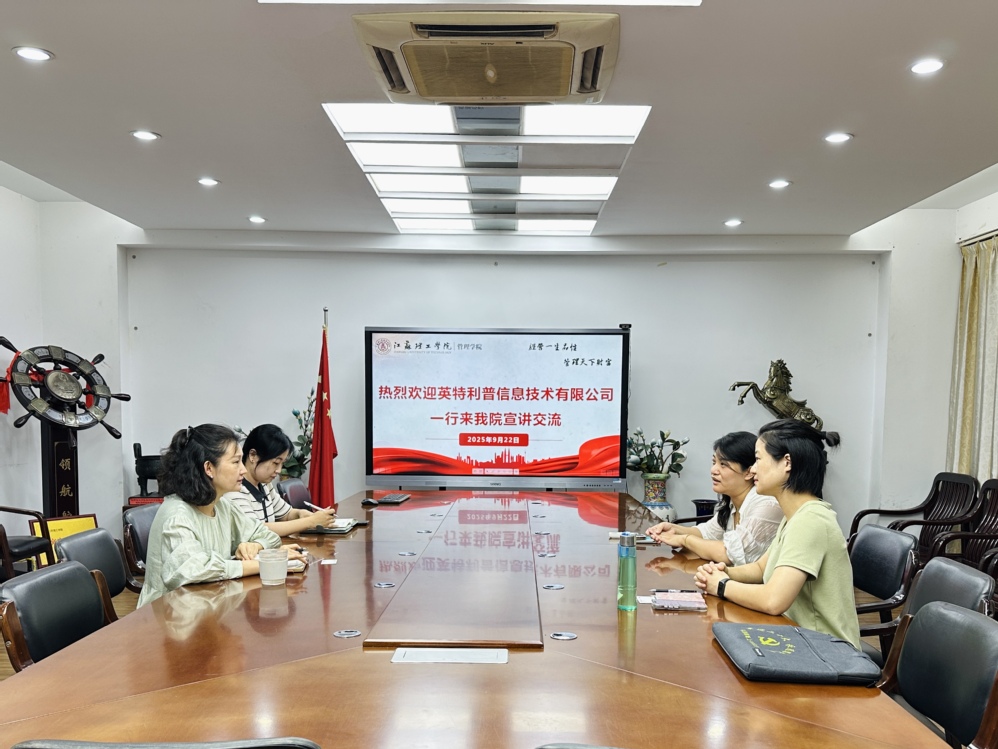 为进一步深化产教融合,推动校企协同创新,2025年9月22日下午,英特利普信息技术有限公司应邀来我院进行校企合作洽谈。管理学院党委副书记、副院长荣文婷和学院就业指导员、2026届毕业班辅导员杨柳参加了本次交流活动。