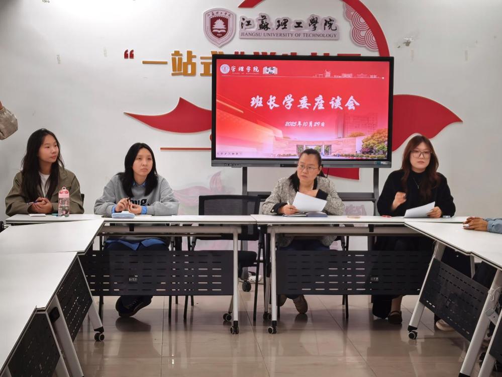 2025年10月29日中午,管理学院在一号楼一站式笃行社区组织召开2025-2026学年班长学委座谈会。学生工作办公室主任安阳阳、教务办朱晴雯老师与各班级班长、学习委员代表参加会议。