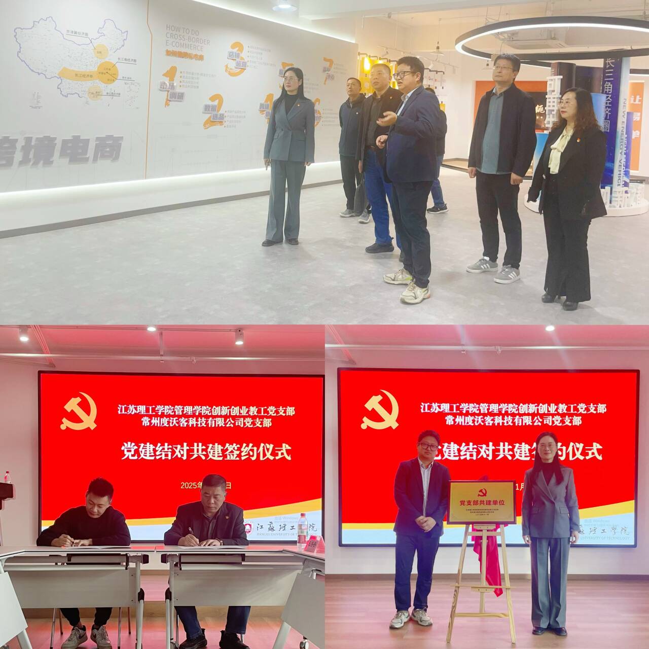 在陈江的陪同下,支部党员一行参观了企业创新创意中心,详细了解公司的创新实践与发展成果。随后,双方举行党建共建签约揭牌仪式。管理学院教工创新创业党支部书记杨晋与常州度沃客科技有限公司党支部书记张士豪共同签署共建协议,谢芳与陈江为“党建共建单位”揭牌。